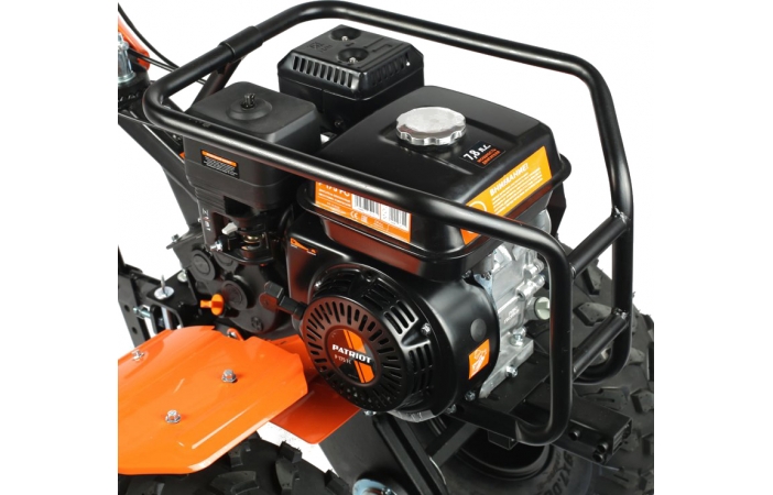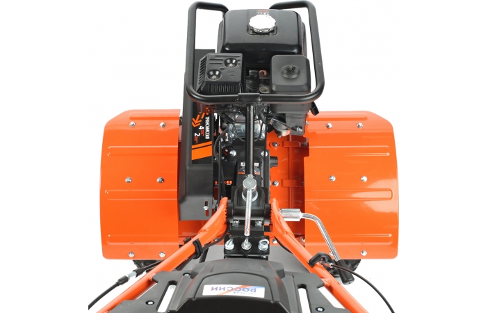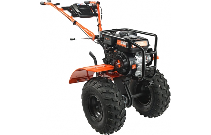 Это мнгогофункциональный мотокультиватор с двигателем 7,8 л.с. Укомплектован фрезами и большими пневматическими колесами. Переключение скоростей осуществляется через коробку передач, а включение пониженной или повышенной передачи можно производить перекидыванием ремня с одной проточки шкива на другую: 4 вперед/2 назад. Уже установленный на мотокультиватор трехручейковый шкив дает возможность подключать косилку и снегоуборщик, а мощный прицепной узел является самым распространенным в России и дает возможность устанавливать различное навесное оборудование, включая тележку. Отдельно можете приобрести и установить тележку, плуг, окучник, картофелевыкапыватель.Усиленная рама защищает воздушный фильтр, бензобак и глушитель от поломок во время транспортировки и хранении. Такая рама решает проблему погрузки и разгрузки мотоблока, теперь есть за что удобно взять и поднять мотокультиватор.