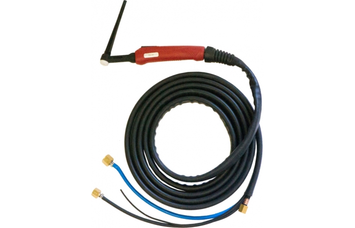 Горелка оснащена по ЕВРО стандарту: силовой шланг М12х1, газовый шланг 1/4G, водный шланг 3/8G. Горелка должна дополнительно укомплектовываться силовым разъемом TIG PLUG 50 со шлангом на воду 0.6м с б/р соединителем.