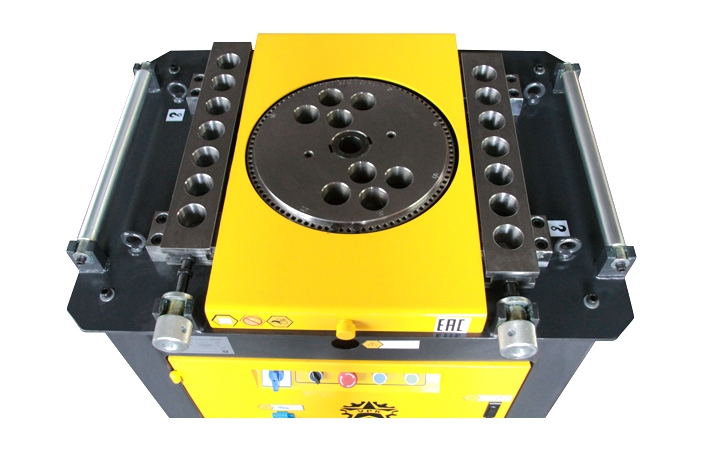 Две регулируемые линейки и набор приспособлений (штифты, втулки, упорный угольник) позволяют делать двойной гиб за один ход рабочего диска.