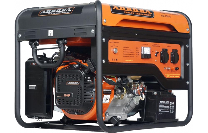 Электростанция бензиновая с рабочей мощностью 5.0 кВт, 1 фаза, двигатель Aurora, запуск электрический (ключом) + ручной (пусковым тросиком), топливный бак 25 л, альтернатор с электронным регулятором напряжения.